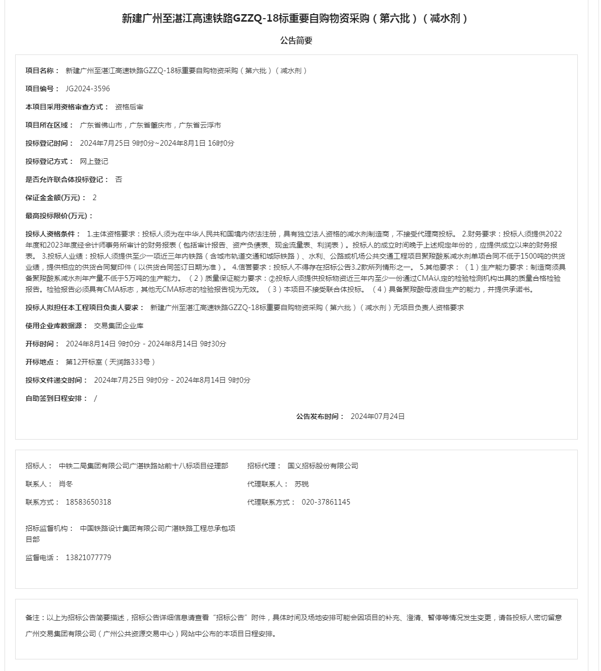 新建广州至湛江高速铁路GZZQ-18标重要自购物资采购(第六批)(减水剂)招标公告