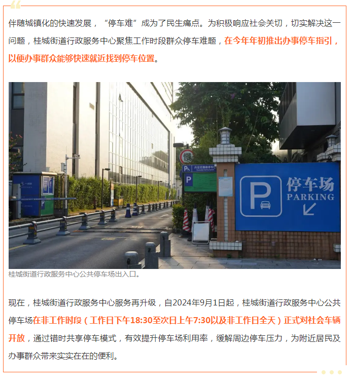 据介绍,该停车场拥有130个停车位,以往主要服务于工作日到访的办事群众。如今,非工作时段的开放,不仅拓宽了停车资源的使用范围,最大限度为社会提供公共停车服务,切实提升市民的幸福感和满意度,更体现了桂城街道行政服务中心以人为本、服务为民的宗旨,助力构建“有位、有序、共建、共享”的停车新格局。