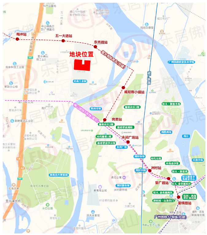 从地块位置看,该地块位于里水东部板块,地理位置优越,紧邻广州金沙洲,南侧是原志高工业园,周边建有南海有轨电车里水示范段,还规划有佛山地铁8号线,距离在建的有轨电车东秀路站南侧约300米。