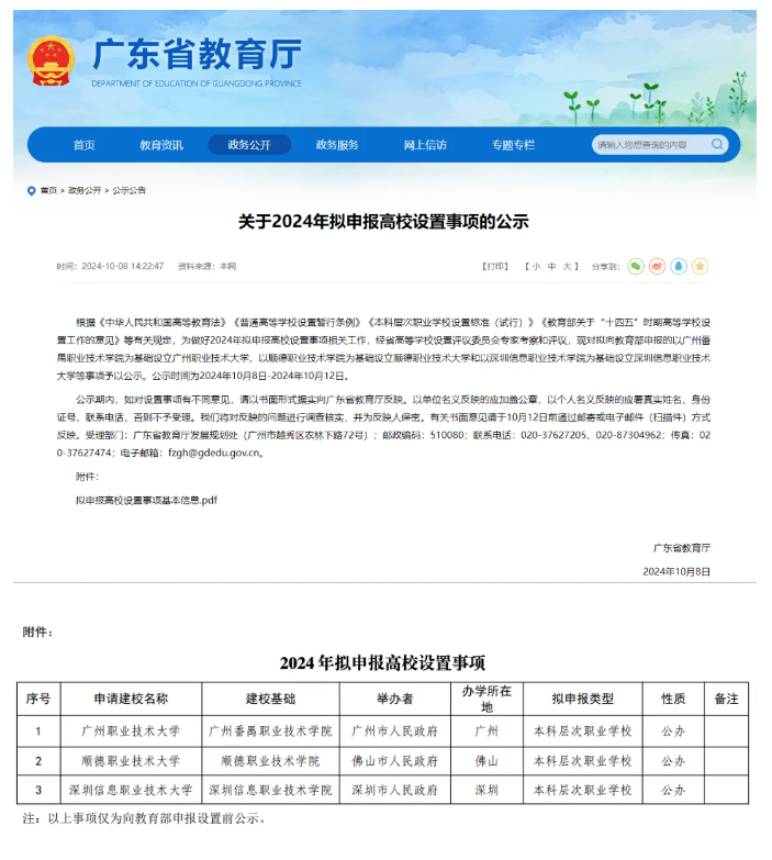 10月8日,广东省教育厅发布《关于2024年拟申报高校设置事项的公示》,对拟向教育部申报的以广州番禺职业技术学院为基础设立广州职业技术大学、以顺德职业技术学院为基础设立顺德职业技术大学和以深圳信息职业技术学院为基础设立深圳信息职业技术大学等事项予以公示。公示时间为2024年10月8日-2024年10月12日。