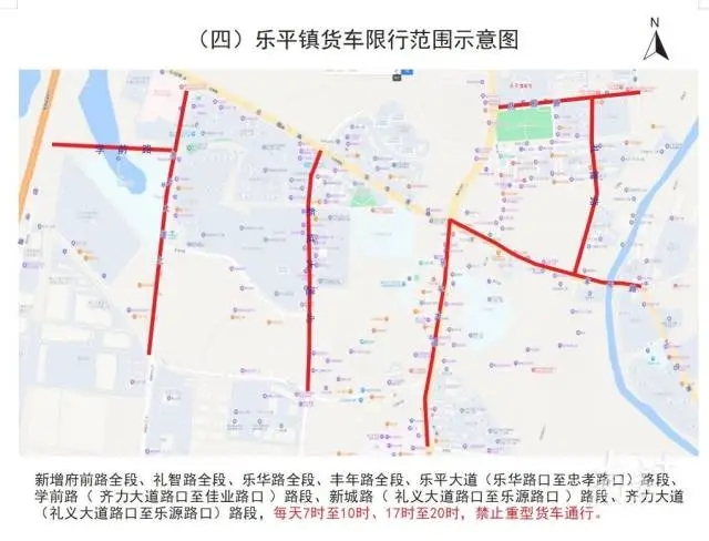 乐平镇货车需求较多,为此该区域限行范围新增府前路全段、礼智路全段、乐华路全段、丰年路全段、乐平大道(乐华路口至忠孝路口)路段、学前路(齐力大道路口至佳业路口)路段、新城路(礼义大道路口至乐源路口)路段、齐力大道(礼义大道路口至乐源路口)路段,每天7时至10时、17时至20时,禁止重型货车通行。