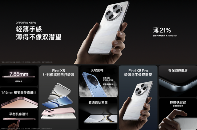 OPPO作为移动影像领域的引领者,这次通过OPPO Find X8系列再一次拉高了移动拍摄的表现。诚然,Find X8系列升级的不止影像,在机身设计及续航、性能等方面都有着强悍表现。OPPO Find X8系列还拥有轻薄高颜值的机身,其中X8标准版黄金尺寸配上直屏直边握感更舒服,而且还是极窄边框设计,亮屏后的沉浸感非常震撼。
