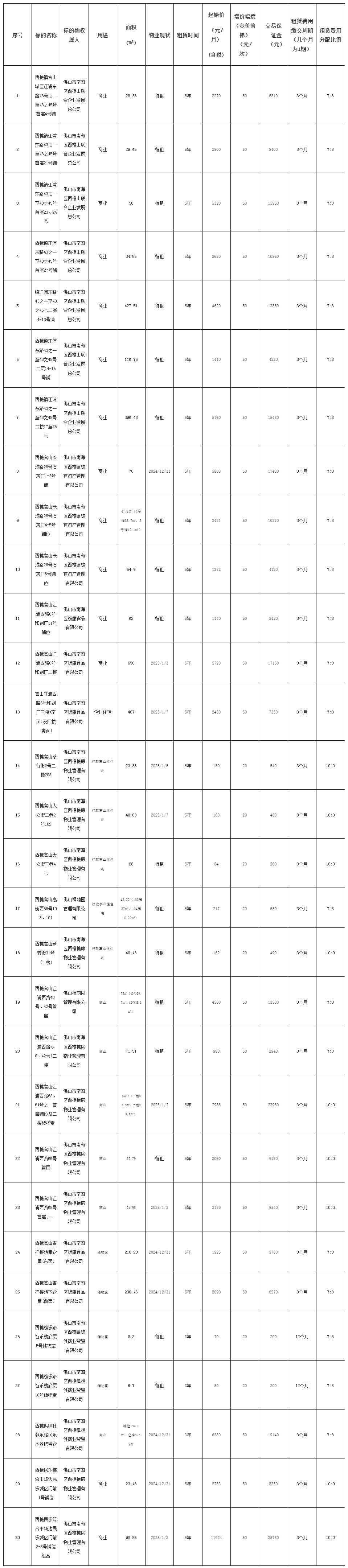 备注:序号为22、23物业:上述物业供电属于二次供电,乙方签订租赁合同时需同时签订《供用电协议书》,用电需另行按用电量收取用电管理服务费0.38元/度;另每月需缴交¥30元垃圾清理费。物业内现搭建有钢结构夹层,夹层面积不在本次计租面积内。物业无权属证明,不得经营有污染、污水产生等行业,经营行业和装饰、装修方案必须先向甲方书面申请,经甲方审批同意后方可施工,准入行业以旅游、文化、精品等相关内容。