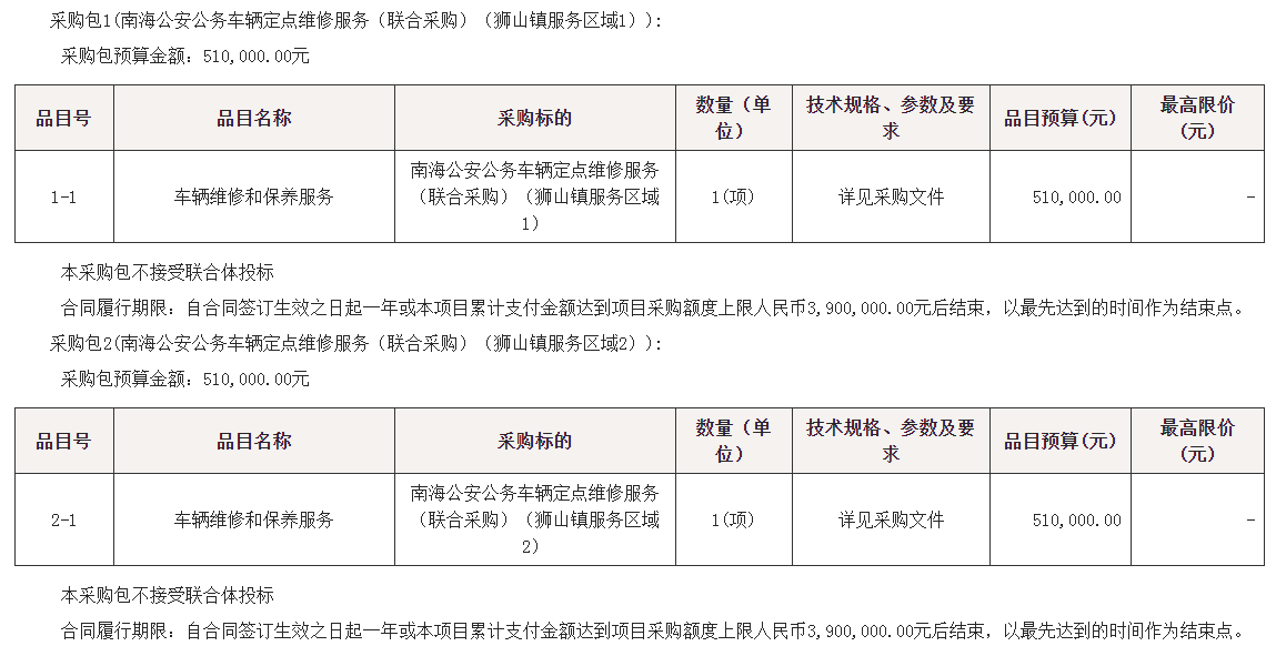 项目名称:南海公安公务车辆定点维修服务(联合采购)(二次)