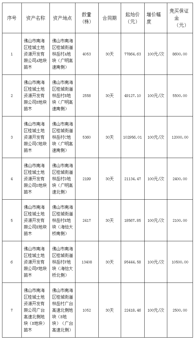 5、苗木种植于地上,苗木的修剪、挖掘、打包、迁移、运输和垃圾清运等工作、相应的费用及风险由竞得人承担。
