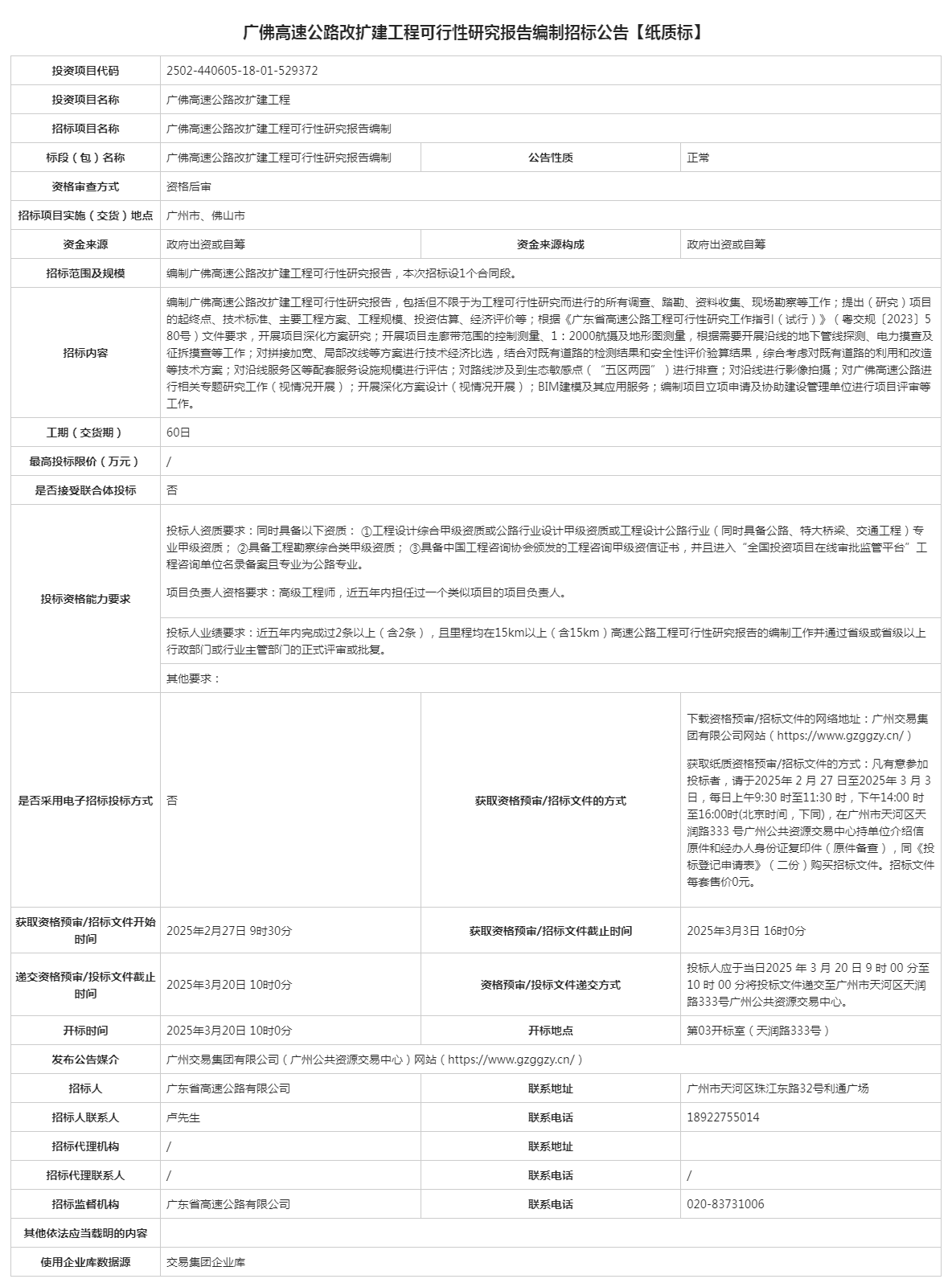 广佛高速公路改扩建工程可行性研究报告编制招标公告