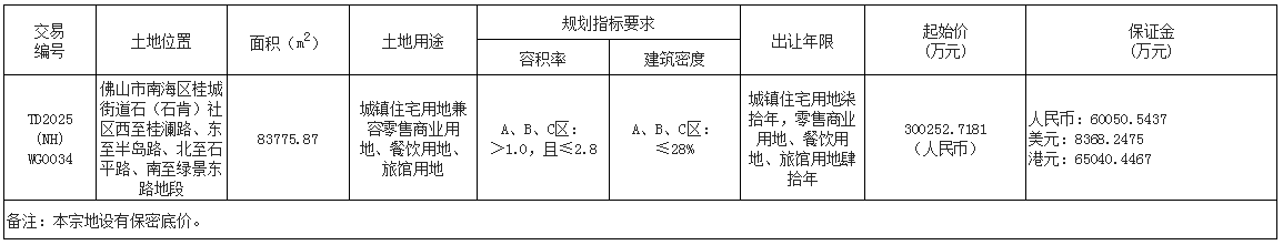九、自本次公告起至网上挂牌截止期间,如有关于本宗地竞买文件的修改、澄清、说明等将通过网上交易系统以及佛山市南海区人民政府网发布,请有意参与竞买者密切留意。其它未尽事宜,详见本宗地的网上挂牌出让文件。