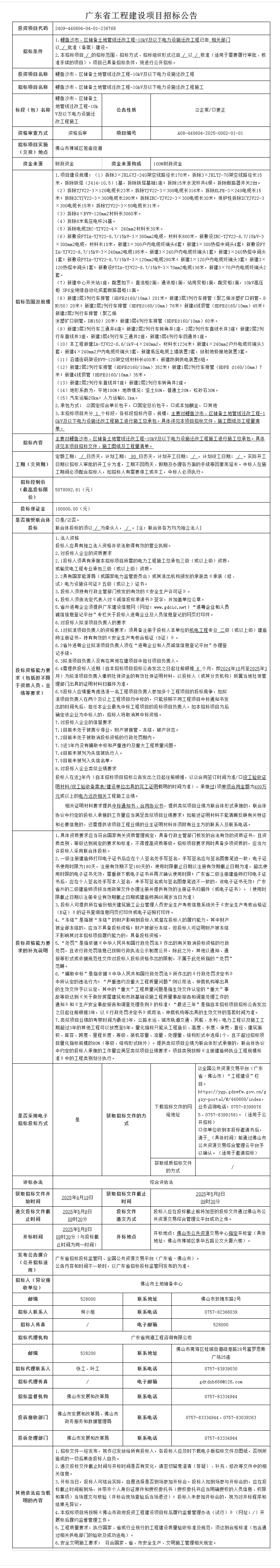 禅城鲤鱼沙市、区储备土地管线迁改工程-10kV及以下电力设施迁改工程施工招标公告