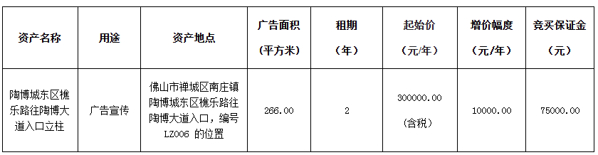 禅城陶博城东区樵乐路往陶博大道入口立柱租赁公告