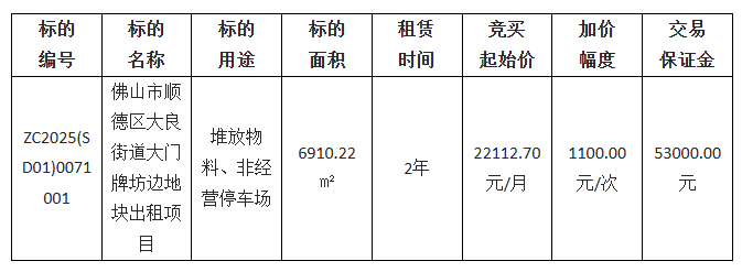 佛山市顺德区大良德良物业管理公司采用网上竞价方式出租位于佛山市顺德区大良街道大门牌坊边地块,欢迎符合资格的竞买人参与竞价。
