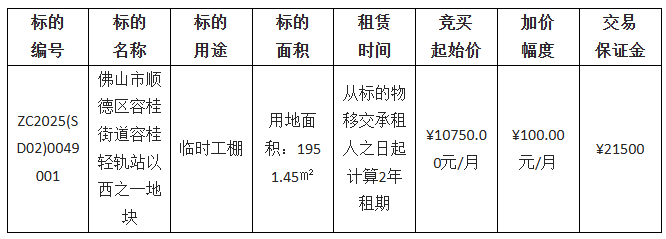 出租方采用网上竞价方式出租位于佛山市顺德区容桂街道容桂轻轨站以西之一地块租赁权竞投,欢迎符合资格的竞买人参与竞价。