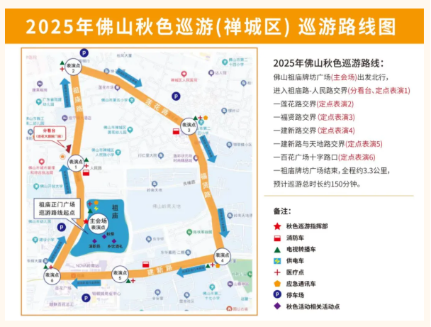 佛山祖庙牌坊广场(主会场)出发北行,进入祖庙路—人民路交界(分看台、定点表演1)—莲花路交界(定点表演2)—福贤路交界(定点表演3)—建新路交界(定点表演4)—建新路与天地路交界(定点表演5)—百花广场十字路口(定点表演6)—祖庙牌坊广场结束,全程约3.3公里,主会场表演时间约90分钟,巡游总时长约150分钟。