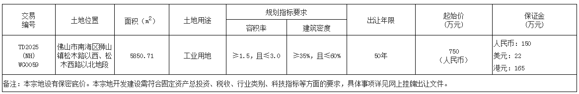备注:本宗地设有保密底价。本宗地开发建设需符合固定资产总投资、税收、行业类别、科技指标等方面的要求,具体事项详见网上挂牌出让文件。