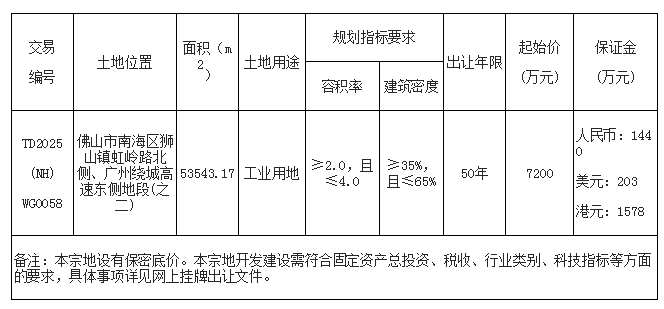 八、自本次公告起至网上挂牌截止期间,如有关于本宗地竞买文件的修改、澄清、说明等将通过网上交易系统以及佛山市南海区人民政府网发布,请有意参与竞买者密切留意。其它未尽事宜,详见本宗地的网上挂牌出让文件。