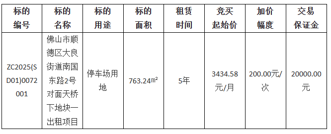 佛山市顺德区大良德良物业管理公司采用网上竞价方式出租位于佛山市顺德区大良街道南国东路2号对面天桥下地块一,欢迎符合资格的竞买人参与竞价。