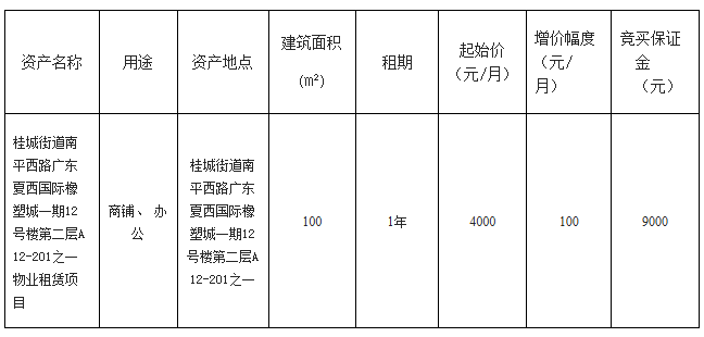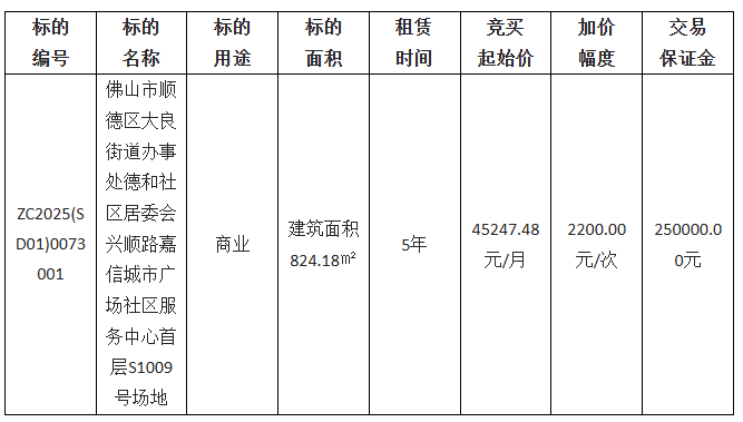 佛山市顺德区盈良物业管理有限公司采用网上竞价方式出租位于佛山市顺德区大良街道办事处德和社区居委会兴顺路嘉信城市广场社区服务中心首层S1009号场地,欢迎符合资格的竞买人参与竞价。