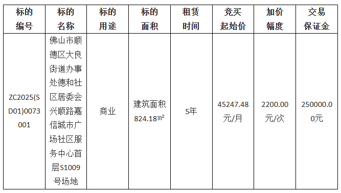 1.项目名称:佛山市顺德区大良街道办事处德和社区居委会兴顺路嘉信城市广场社区服务中心首层S1009号场地物业出租项目(二次)