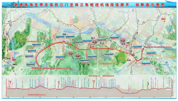 珠肇高铁江机段是珠海至肇庆高铁的重要组成部分,线路自深茂铁路区间引出,经江门鹤山、佛山高明,终至珠三角枢纽机场站,全长98.6公里。项目设计时速350公里,全线共设置4座车站。