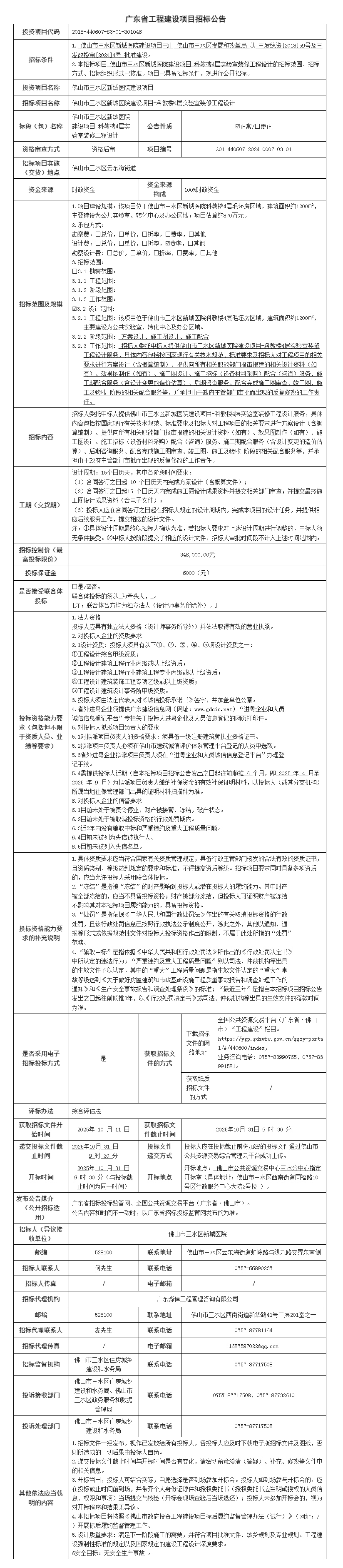 佛山市三水区新城医院建设项目-科教楼4层实验室装修工程设计招标公告