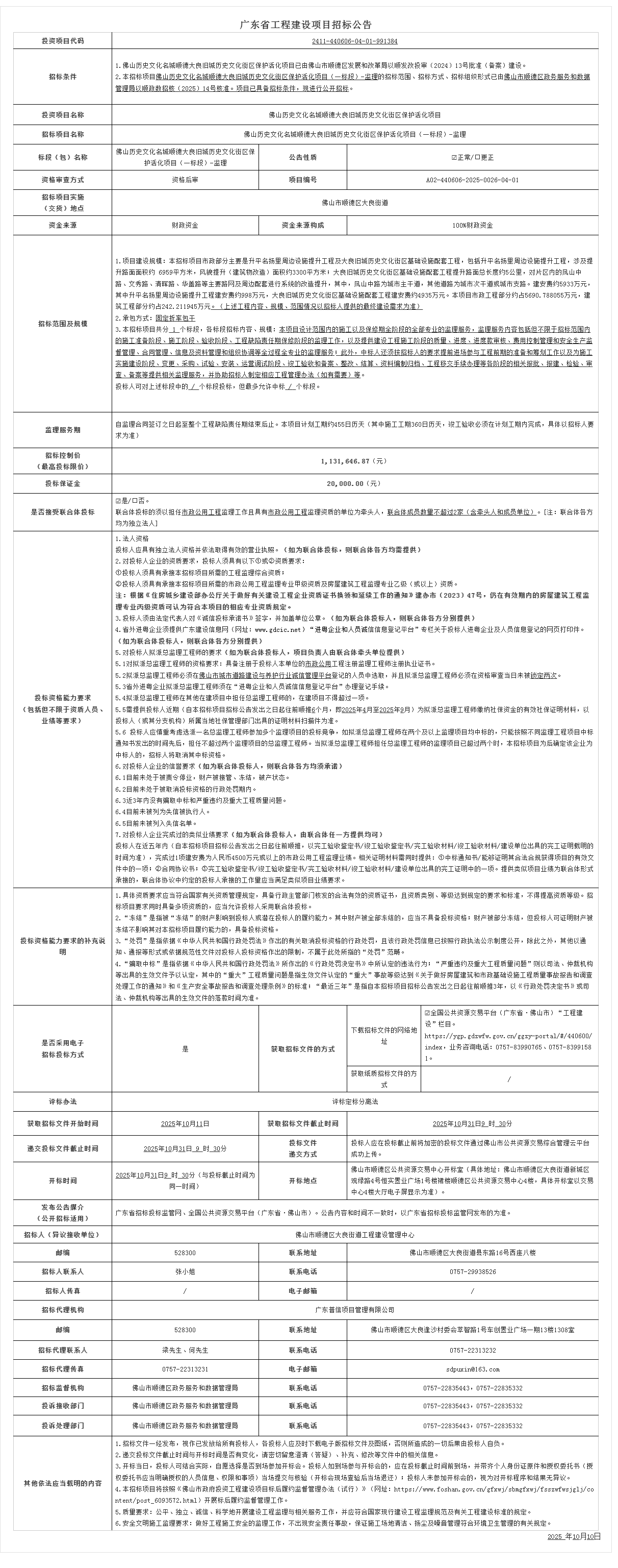 佛山历史文化名城顺德大良旧城历史文化街区保护活化项目(一标段)-监理招标公告