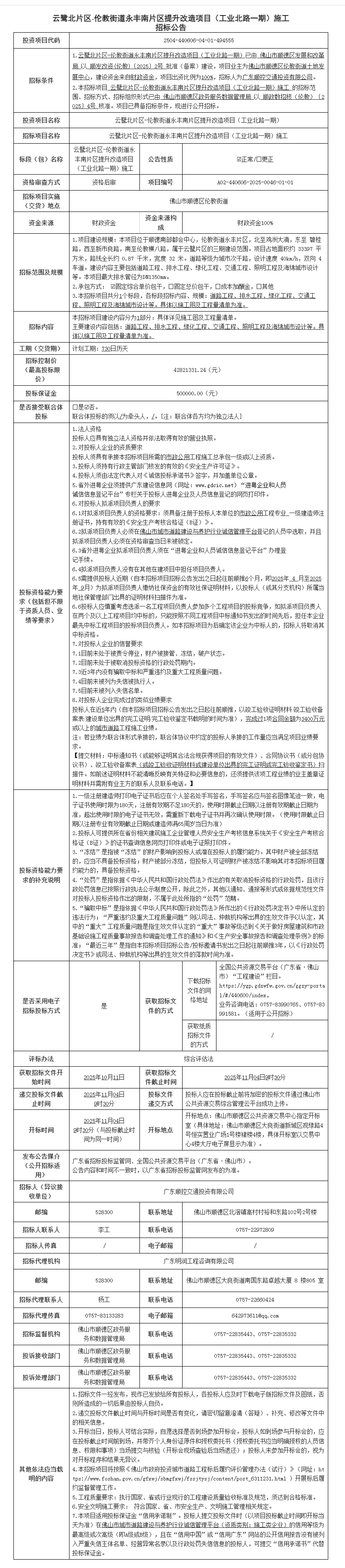 顺德伦教云鹭北片区-伦教街道永丰南片区提升改造项目(工业北路一期)施工招标公告