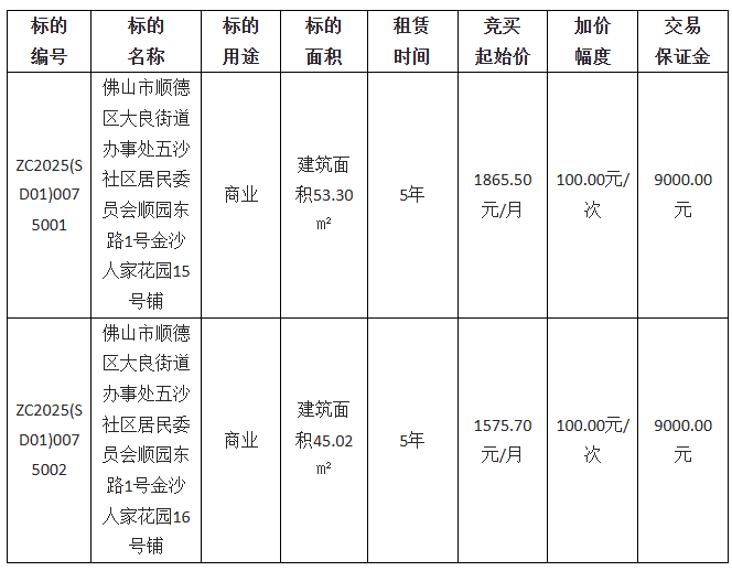 佛山市顺德区景良投资发展有限公司采用网上竞价方式出租位于佛山市顺德区大良街道中区居委会东康路富豪大厦A座02、03、31号之二铺等2宗物业,欢迎符合资格的竞买人参与竞价。