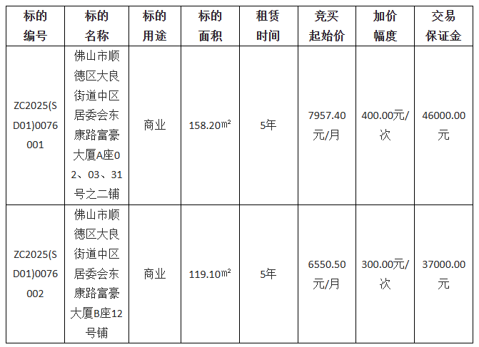 概述:佛山市顺德区景良投资发展有限公司采用网上竞价方式出租位于佛山市顺德区大良街道中区居委会东康路富豪大厦A座02、03、31号之二铺等2宗物业......