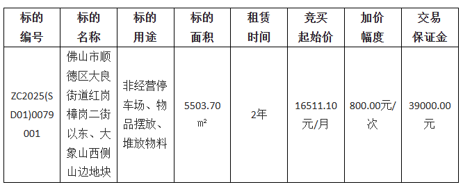 佛山市顺德区景良投资发展有限公司采用网上竞价方式出租位于佛山市顺德区大良街道红岗樟岗二街以东、大象山西侧山边地块,欢迎符合资格的竞买人参与竞价。