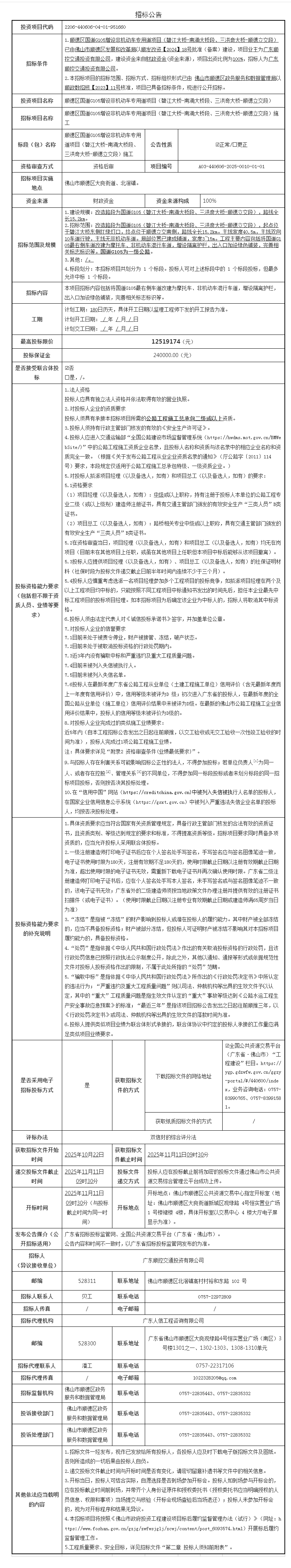 顺德区国道G105增设非机动车专用道项目(碧江大桥-南涌大桥段、三洪奇大桥-顺德立交段)施工招标公告