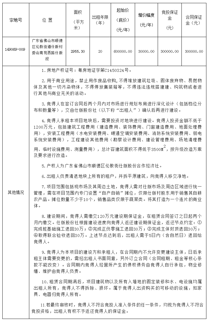 九、自本次公告起至网上挂牌截止期间,如有关于本地块网上挂牌出租文件的修改、澄清、说明等将通过上述网上交易系统、佛山市顺德区公共资源交易中心网站发布,不再另行通知,请有意参与竞租者密切留意。其它未尽事宜,详见本地块的网上挂牌出租文件。