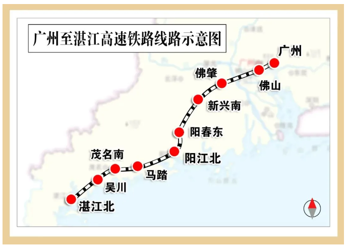 广湛高铁自广州站引出,向西经广东省佛山市、肇庆市、云浮市、阳江市、茂名市、湛江市,终至湛江北站,全长401公里,设计时速350公里,是连接粤港澳大湾区和海南自由贸易港、北部湾城市群高速铁路大通道的重要组成部分。
