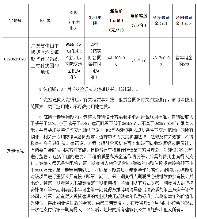 九、自本次公告起至网上挂牌截止期间,如有关于本地块网上挂牌出租文件的修改、澄清、说明等将通过上述网上交易系统、佛山市顺德区公共资源交易中心网站发布,不再另行通知,请有意参与竞租者密切留意。其它未尽事宜,详见本地块的网上挂牌出租文件。