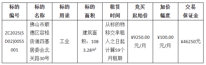 出租方采用网上竞价方式出租位于佛山市顺德区容桂街道四基居委会北关路30号租赁权竞投,欢迎符合资格的竞买人参与竞价。
