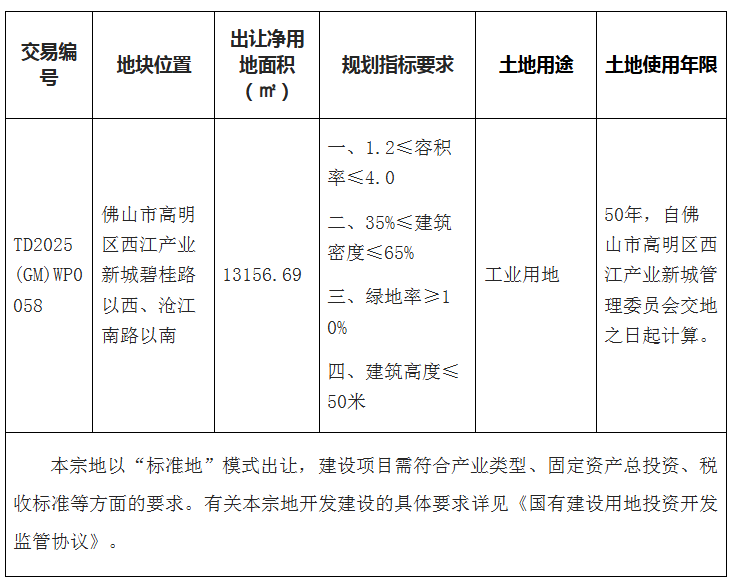 佛山市高明区西江产业新城海天大道以西、三景路以北网上拍卖出让