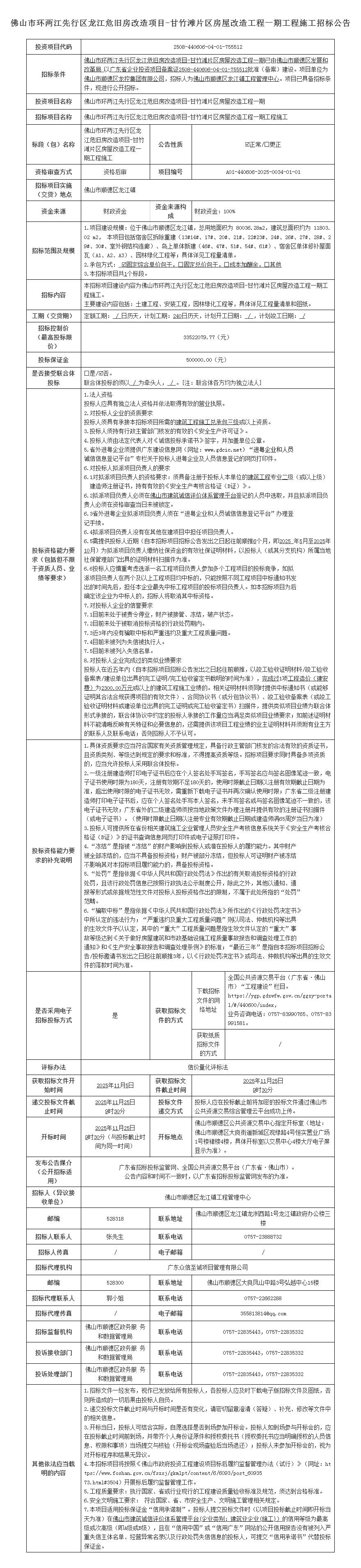 佛山市环两江先行区龙江危旧房改造项目-甘竹滩片区房屋改造工程一期工程施工招标公告
