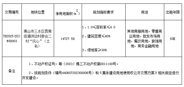 九、自本次公告起至网上挂牌截止期间,如有关于本宗地竞买文件的修改、澄清、说明等将通过网上交易系统以及佛山市南海区人民政府网发布,请有意参与竞买者密切留意。其它未尽事宜,详见本宗地的网上挂牌出让文件。