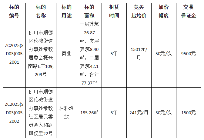 1.项目名称:佛山市顺德区伦教街道办事处常教居委会振兴南路E座109,209号等两宗物业公开招租项目