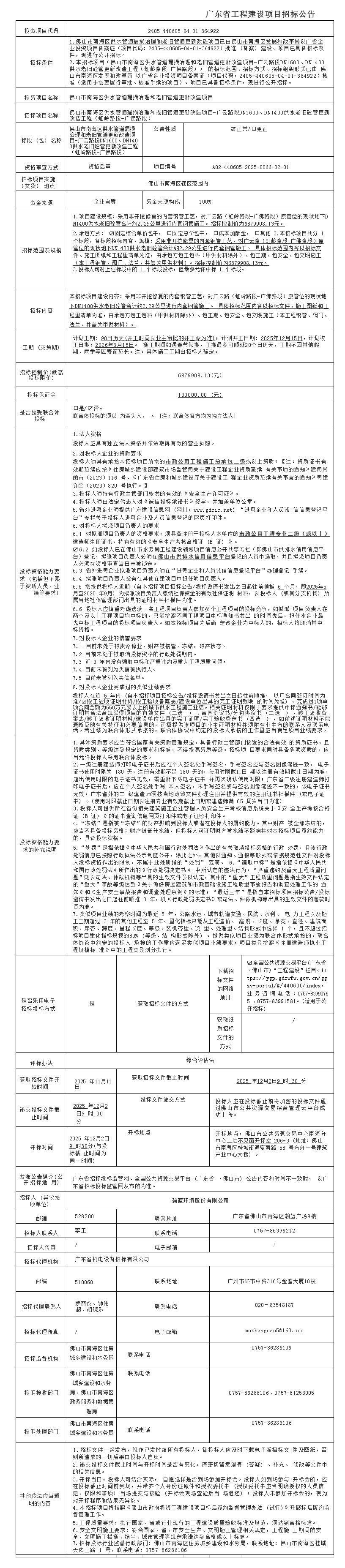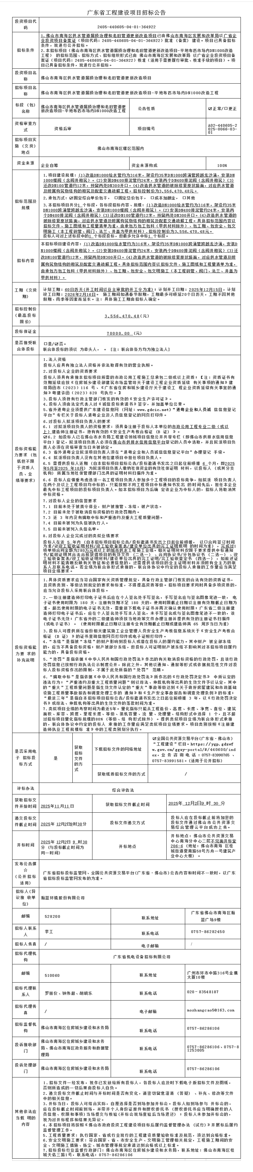 佛山市南海区供水管道漏损治理和老旧管道更新改造项目-平地布匹市场内DN1000改造工程招标公告