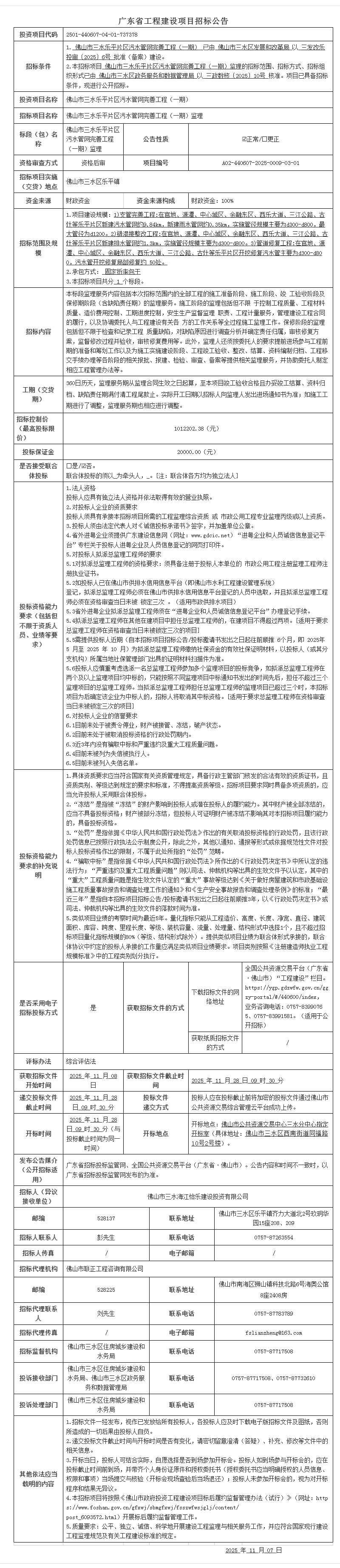 佛山市三水乐平片区污水管网完善工程(一期)监理招标公告