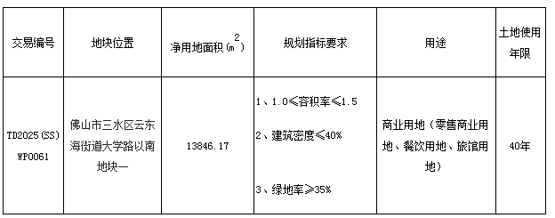 五、有意参与竞买者可于2025年11月7日后登录网上交易系统下载TD2025(SS)WP0062地块的《佛山市三水区国有建设用地使用权网上拍卖出让文件》。