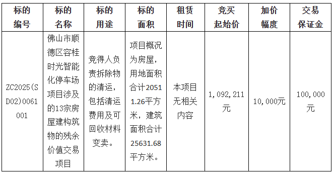 佛山市顺德区容桂土地发展中心采用网上竞价方式转让位于佛山市顺德区容桂时光智能化停车场项目涉及的13宗房屋建构筑物的残余价值交易项目,欢迎符合资格的竞买人参与竞价。