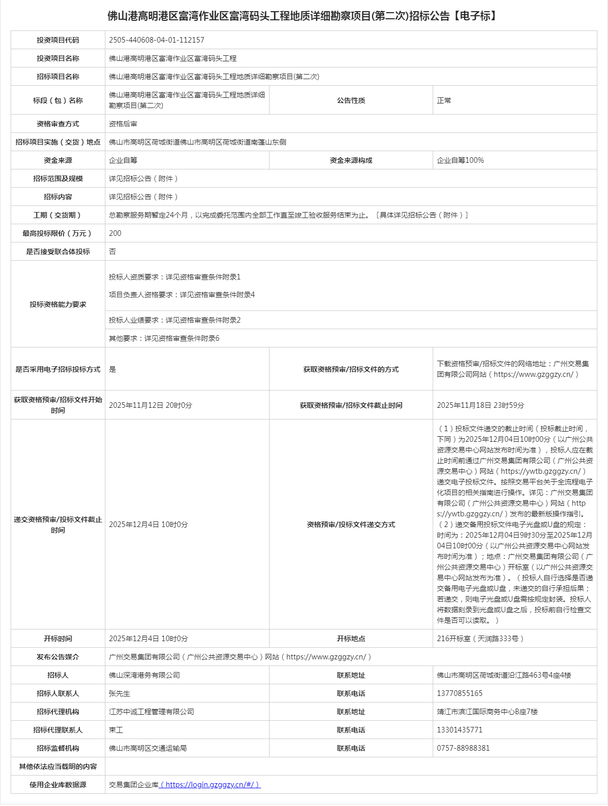 佛山港高明港区富湾作业区富湾码头工程地质详细勘察项目(第二次)招标公告