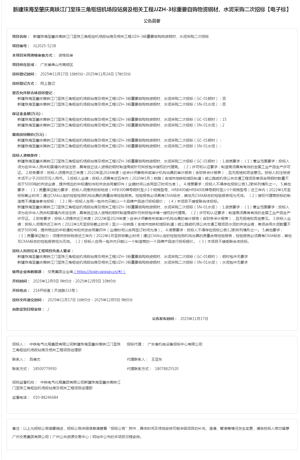 新建珠海至肇庆高铁江门至珠三角枢纽机场段站房及相关工程JJZH-3标重要自购物资钢材、水泥采购二次招标