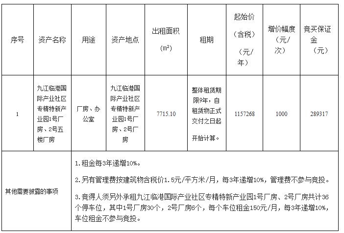 8.其他需要披露的事项:上述物业按现状招租。表内面积数据仅供参考,以实际交付出租面积为准,不影响租赁费用标准;该物业不适用于危险化学品的存储及高污染行业进驻;严格按照项目信息的物业用途使用,不得随意改变的物的用途。