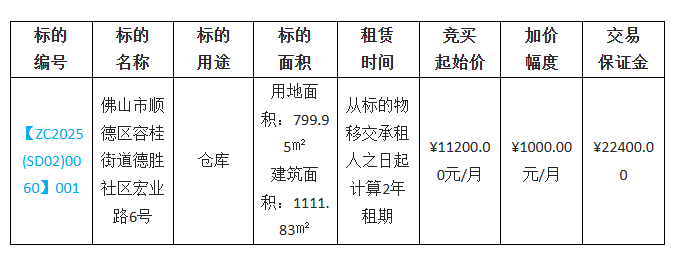 出租方采用网上竞价方式出租位于佛山市顺德区容桂街道德胜社区宏业路6号租赁权竞投,欢迎符合资格的竞买人参与竞价。