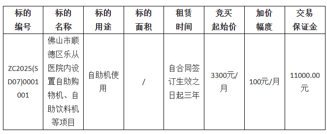 广州金良工程咨询有限公司受佛山市顺德区乐从医院委托采用网上竞价方式出租佛山市顺德区乐从医院内设置自助购物机、自助饮料机场地使用权,欢迎符合资格的竞买人参与竞价。