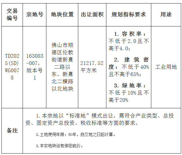 五、有意参与竞买者可于2025年11月21日后登录网上交易系统下载TD2025(SD)WG0078地块的《佛山市顺德区国有建设用地使用权网上挂牌出让文件》。