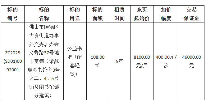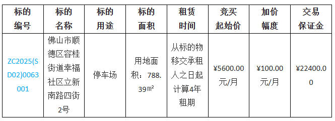 概述:出租方采用网上竞价方式出租位于佛山市顺德区容桂街道幸福社区立新南路四街2号租赁权竞投,欢迎符合资格的竞买人参与竞价。......