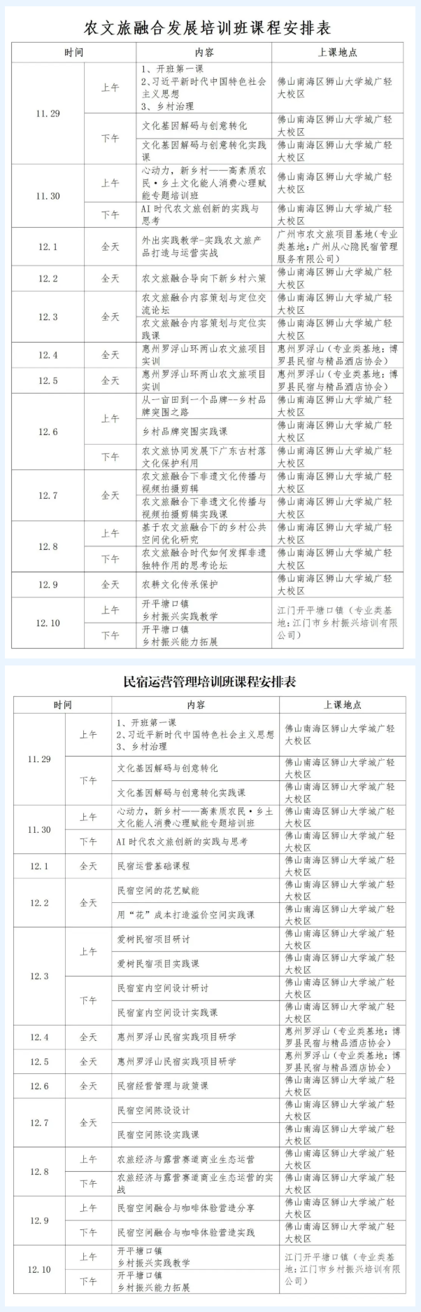 (3)实践研学与实地教学:组织学员前往佛山、惠州南昆山珠三角等地等现场教学点开展实地研学,深入体验“从文旅+民宿实践间到品牌”的全过程;了解品牌溯源体系、参与农文旅+民宿与非遗体验活动,激发学员在真实场景中形成创意与产业转化思维。