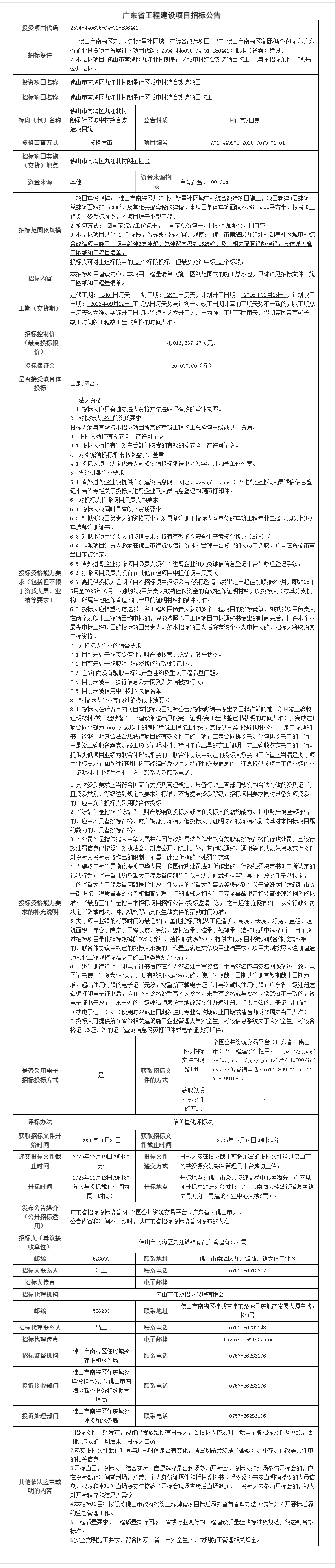 佛山市南海区九江北村朗星社区城中村综合改造项目施工招标公告